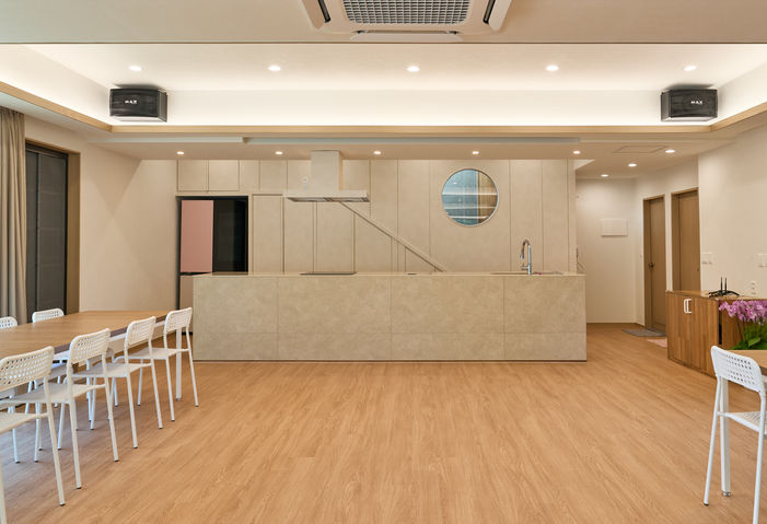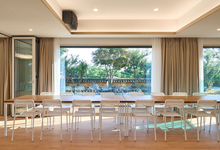 전체 약 50평 규모의 대형 객실로, 세미나실로도 활용 가능합니다. 세미나 용도로는 의자와 빔프로젝터 세팅이 가능하며, 노래방 시설도 갖춰져 있습니다. 폴딩도어로 룸 분리 가능합니다. 폴딩도어 안쪽으로 ACE침대 신형 킹사이즈 침대 총 4개가 있으며 인원에 따라 침대+온돌방으로 숙박 가능합니다. 주방과 아일랜드 식탁이 있어 취사도 가능합니다. 남녀 화장실이 구분되어 있어 더욱 편리합니다.